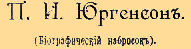 Двадцатого декабря прошлого года, после краткодневной болезни, Пётр Иванович Юргенсон отошёл от нас в другой, неведомый нам мир. Но люди, знавшие его, навсегда сохранят благодарную память о нём, сохранит о нём память и русской музыкальное общество, которому П. И. отдал всю свою жизнь, историк же русской музыкальной жизни отведёт почётную страницу этому славному, энергичному деятелю.